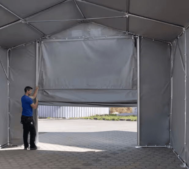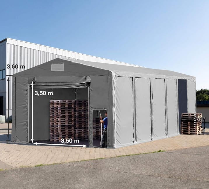 Šotor je opremljen z dvema velikima vhodoma, vsak z dimenzijami 6×3,90 metra, kar omogoča enostaven dostop in premikanje večjih predmetov ali vozil znotraj šotora. Ta velika dostopna vrata so idealna za industrijsko uporabo, kjer je potrebna hitra in učinkovita manipulacija z blagom. Zaradi svoje velikosti in trdnosti je šotor primeren za različne industrijske in komercialne namene, vključno s skladiščenjem gradbenih materialov, vozil ali kot dodatni prostor za proizvodne obrate.