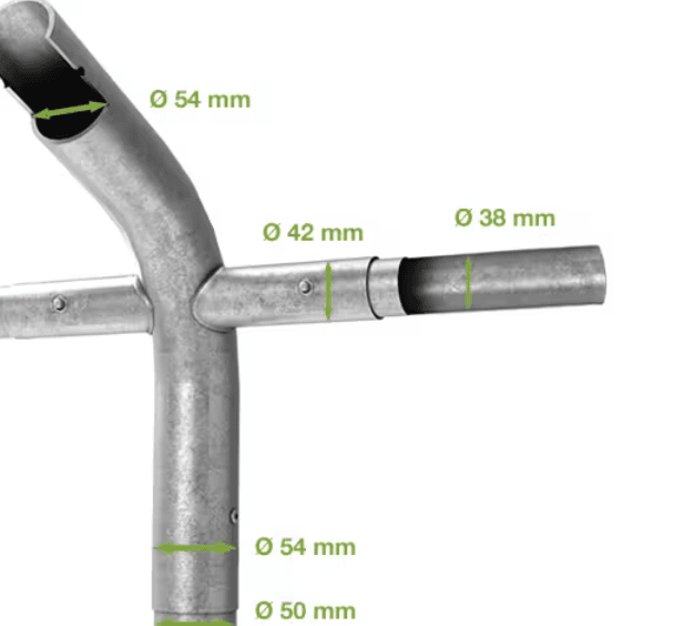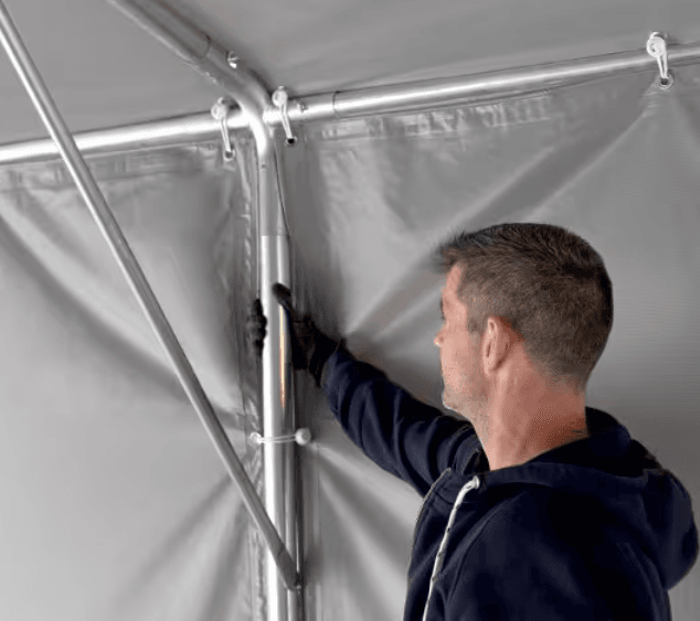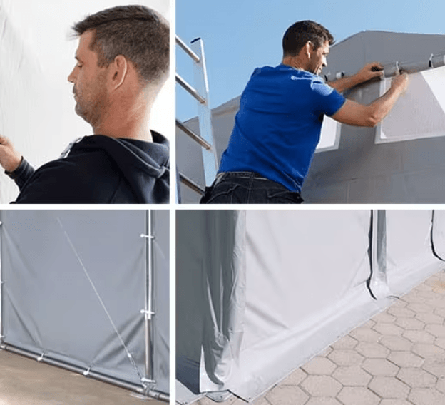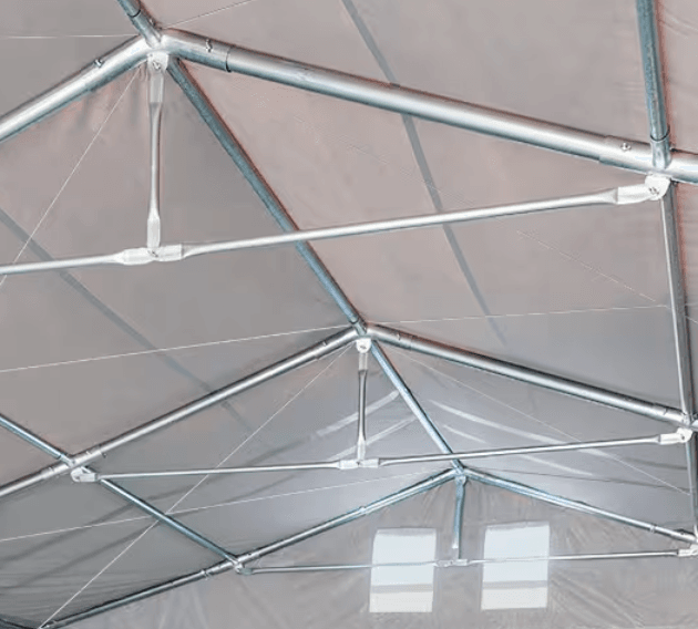 Ponjava šotora je izdelana iz visoko kakovostnega PVC materiala, ki je znan po svoji izjemni vzdržljivosti in odpornosti proti vremenskim vplivom, vključno z dežjem, snegom in UV žarki. Jeklena konstrukcija je narejena iz pocinkanih cevi premera Ø 50 mm in Ø 38 mm, kar zagotavlja robustnost in dolgo življenjsko dobo. Spojniki, ki imajo premer Ø 54 mm in Ø 42 mm, omogočajo trdno in stabilno povezavo vseh delov šotora. Poleg tega je Montažni skladiščni šotor PROF 8x12x5.4×4 PVC dodatno okrepljen z ojačitvami stranskih sten in trojno ojačitvijo strehe, kar zagotavlja izjemno stabilnost, tudi v zahtevnejših vremenskih razmerah.