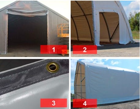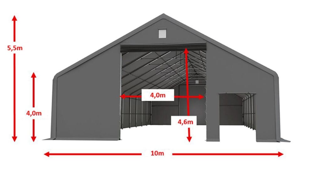 Montažni skladiščni šotor TITAN 10x20x5.5×4 PRIME-tex ima dvoje večjih vrat: glavna vhodna vrata merijo 4×4,6 metra, druga pa cca 4×4 metre, kar omogoča dostop tudi večjim vozilom ali viličarjem. Poleg tega je vgrajen dodatni vhod za osebe, ki omogoča praktičen dostop brez odpiranja večjih vhodov. Vhodna ponjava je opremljena s sistemom EASY UP, dodatno pa jo podpirata napenjalec z ragljo in sistem za dvigovanje z vrvico, kar omogoča enostavno upravljanje tudi v težjih vremenskih pogojih.