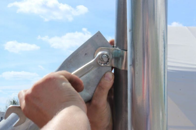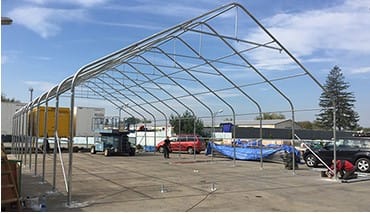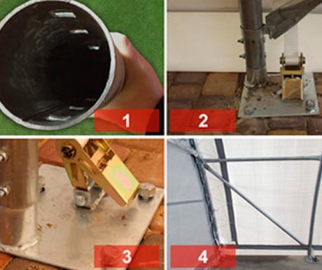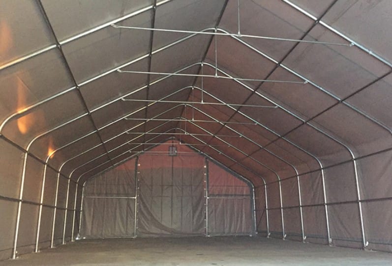 Montažni skladiščni šotor TITAN 10x20x5.5×4 PRIME-tex je izdelan iz kakovostne pocinkane jeklene konstrukcije, odporne na korozijo, udarce in mehanske poškodbe. Cevi premera 76 mm z debelino stene 2 mm ter dodatne ojačitve v vogalih, na strehi in stranicah, zagotavljajo visoko stopnjo stabilnosti. Pritrditev se izvaja s trojnim sidranjem, s čimer je zagotovljena varnost tudi pri močnem vetru.